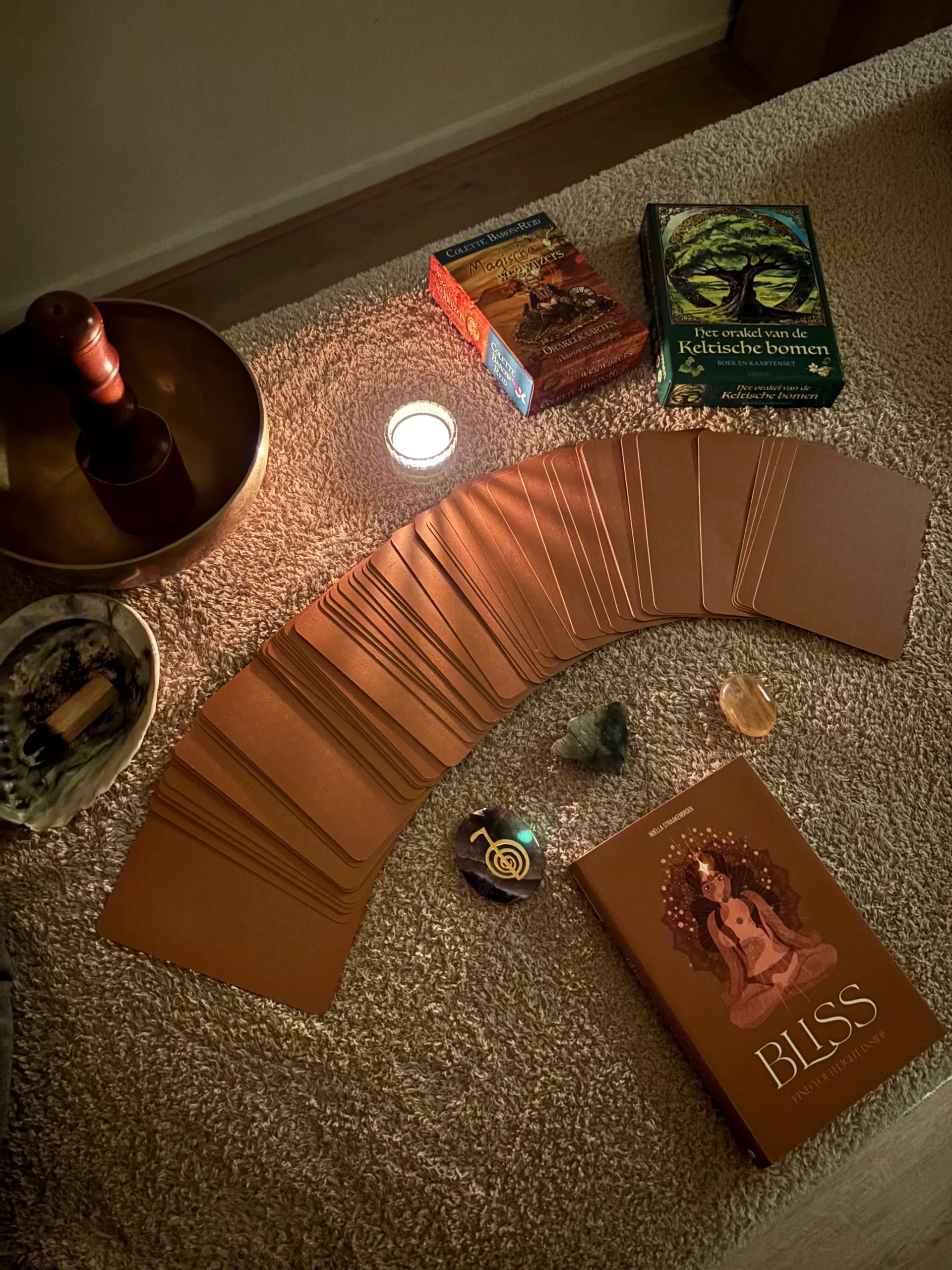 Aan het begin en/of einde van de sessie kun je een kaart trekken uit één van de drie orakel- of bliss-decks. Deze boodschap is intuïtief afgestemd op jou en kan inzicht, inspiratie of een gevoel van steun brengen dat je mee naar huis neemt.